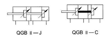 兩種均為QGB||系列相同缸徑的氣缸串聯(lián)而成的雙活塞氣缸,兩活塞運(yùn)動方向相同。QGB||—J系列為增力氣缸,前后兩活塞桿聯(lián)為一體,其桿端出力為單活塞推、拉力之和,拉力為單活塞拉力二倍。此產(chǎn)品也可作為氣液阻尼氣缸應(yīng)用。QGB||—C系列為三位氣缸前后兩活塞桿單獨(dú)分開。當(dāng)前缸行程(S)大于后缸行程(S1)時,前端活塞桿頭有三個位置。